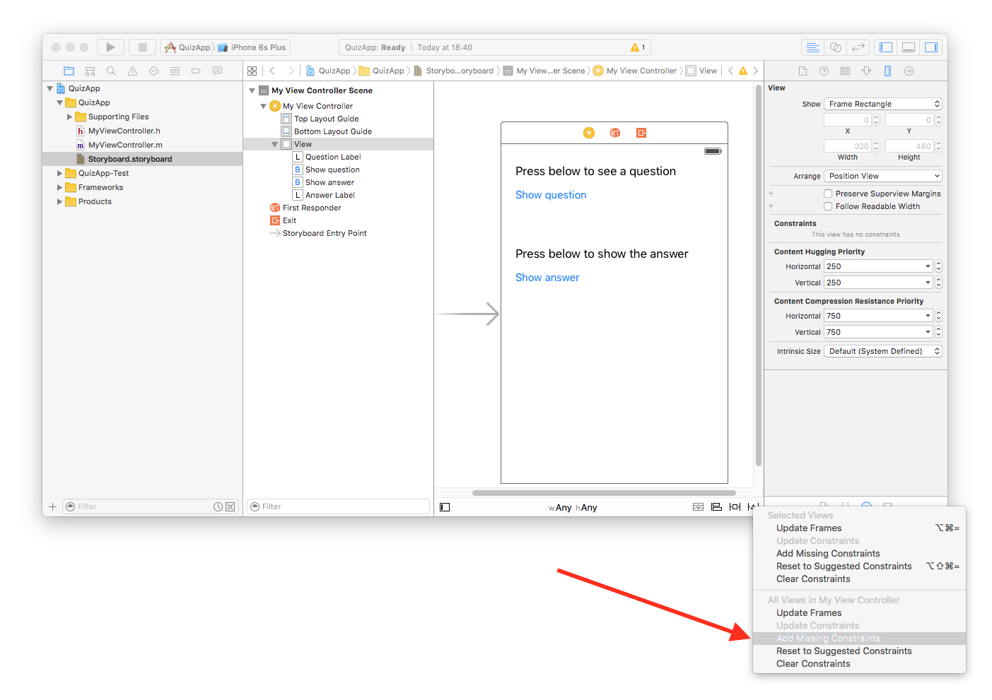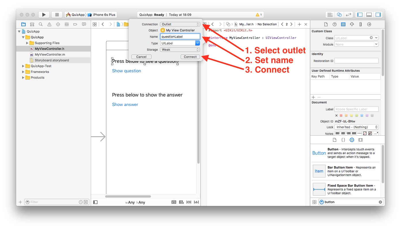 Open up your MyViewController class for editing. You should see the two actions “showQuestion” and “showAnswer”.